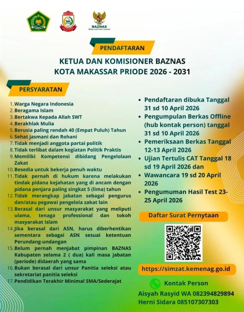 Makassarcess.com – Beredar di grup WhatsApp yang diterima oleh awak media Makassarcess.com yaitu pamflet atau brosur tentang dibukanya Pendaftaran Komisioner BAZNAS Kota Makassar Periode 2026-2031.